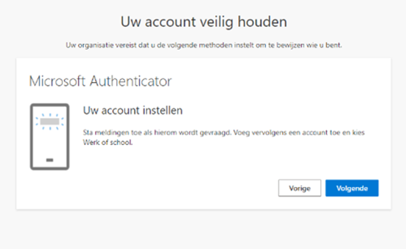 Indien je niet vooraf de Authenticator-app had ingesteld, zoals in scenario 1, dan kun je een geautomatiseerde melding krijgen om de Authenticator-app in te stellen. Deze melding komt pas na een bepaalde periode, waarbij we de datum in goed overleg met de organisatie afspreken.