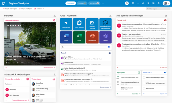 De recentste informatie uit je applicaties is direct zichtbaar in Workspace 365. In één oogopslag zie je al je ongelezen mails, afspraken, nieuws, recent bewerkte documenten en meer.